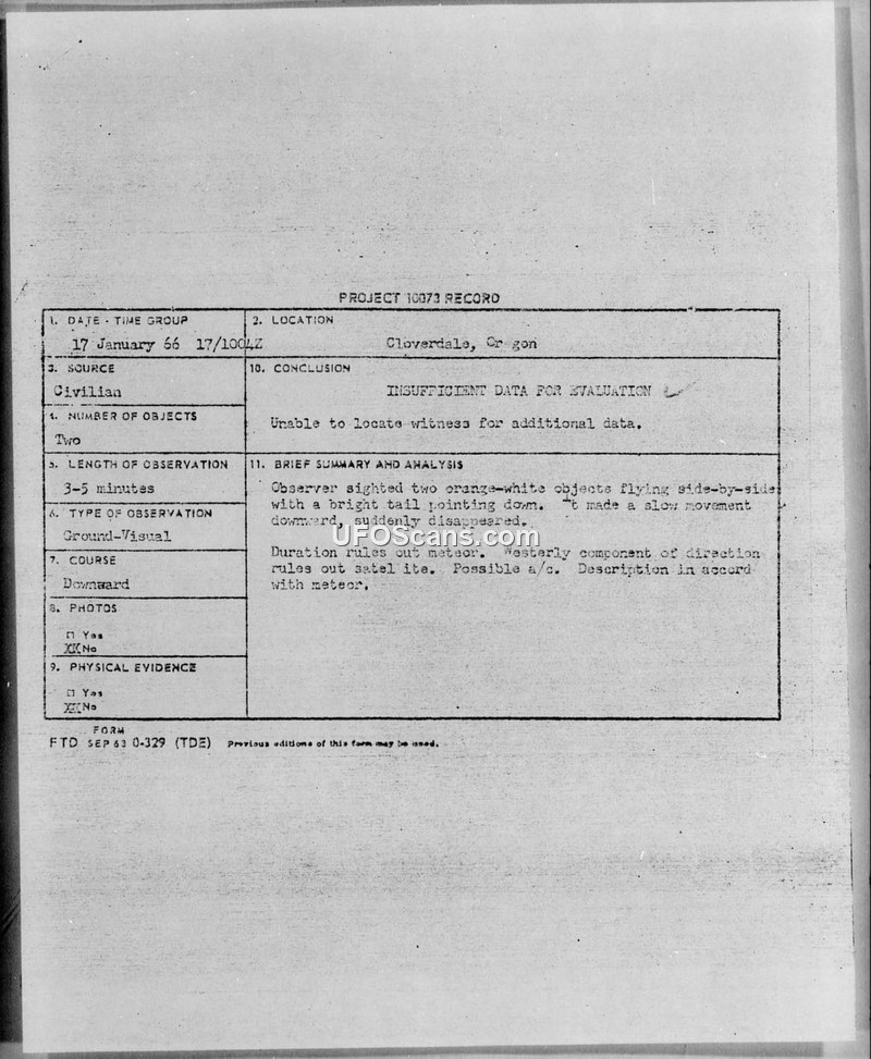 A 1966 UFO sighting in Cloverdale, Oregon, involving two orange-white objects, was investigated by Project Blue Book. The case was closed as having insufficient data after the witness could not be located for further questioning.