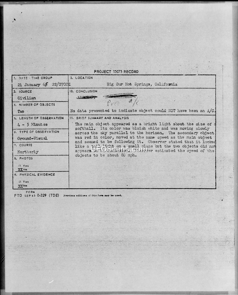 A civilian reported two unidentified objects moving at 60 mph near Big Sur, California, on 21 January 1965. The official conclusion was that the objects could have been aircraft.