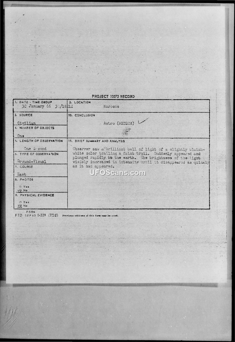 A civilian in Morocco reported a one-second sighting of a bluish-white ball of light on January 30, 1966. The official investigation concluded the object was a meteor.