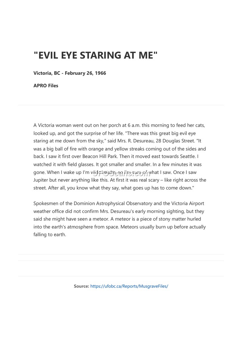 On the morning of February 26, 1966, at approximately 6:00 a.m., a resident of Victoria, British Columbia, named Mrs. R. Desureau, reported observing an unidentified aerial phenomenon. While outside her residence at 28 Douglas Street to feed her cats, she witnessed what she described as a large, evil-looking ball of fire in the sky. The object featured orange and yellow streaks emanating from its sides and rear. Mrs. Desureau first spotted the object over Beacon Hill Park, noting that it subsequently traveled in an easterly direction toward Seattle. She utilized field glasses to observe the object, reporting that it appeared to diminish in size over the course of a few minutes before disappearing entirely. Mrs. Desureau, who emphasized that she was fully awake at the time of the sighting, compared the object to Jupiter but noted it was unlike anything she had previously seen. Following the report, representatives from the Dominion Astrophysical Observatory and the Victoria Airport weather office reviewed the incident. While they did not confirm the sighting, they provided an alternative explanation, suggesting that the witness may have observed a meteor—defined as stony matter entering the earth's atmosphere from space—which typically burns up before reaching the ground.