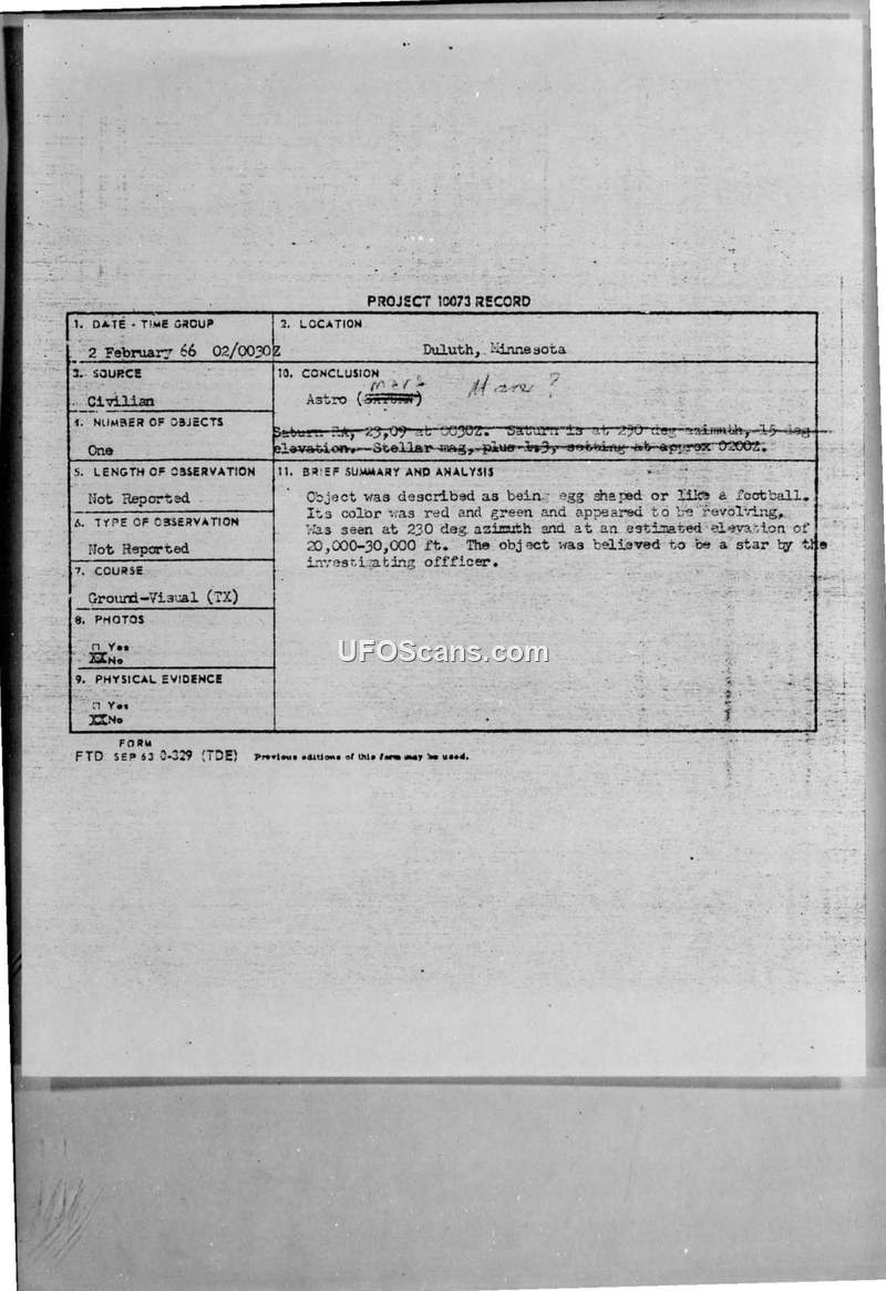 Project 10073 Record — Duluth, Minnesota, 2 February 1966
