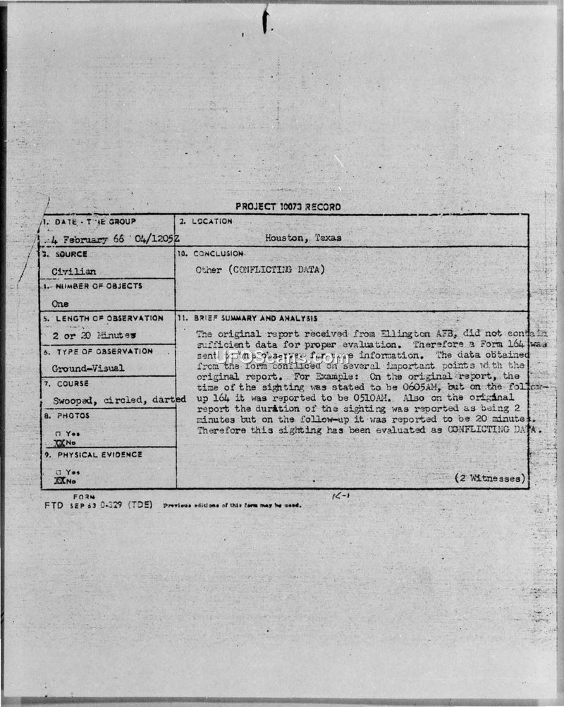 Project 10073 Record — Sighting Incident, Houston, Texas, 4 February 1966
