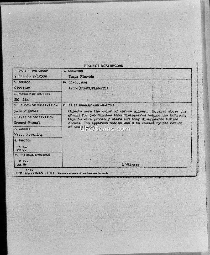 A report detailing three UFO sightings by a single civilian in Tampa, Florida, in 1966. The Air Force concluded the sightings were likely misidentifications of stars or planets by a witness with poor eyesight.