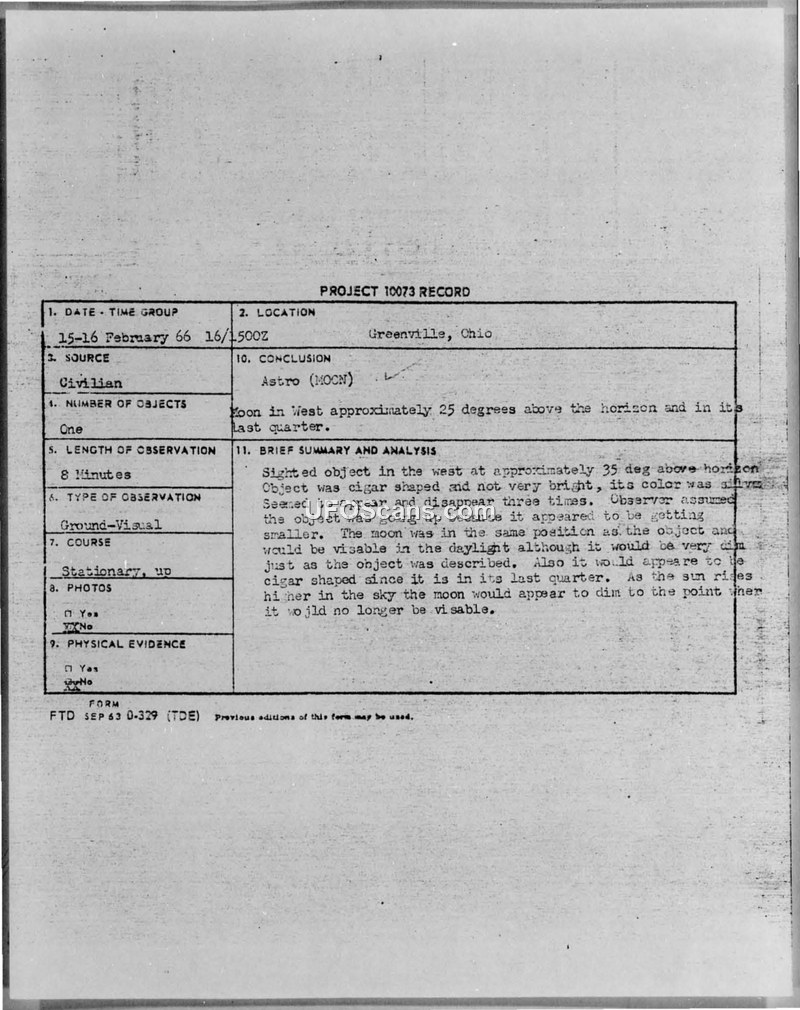 A civilian witness reported a cigar-shaped object in the sky near Greenville, Ohio, in February 1966. The Air Force investigated the report under Project Blue Book and concluded the object was the moon.