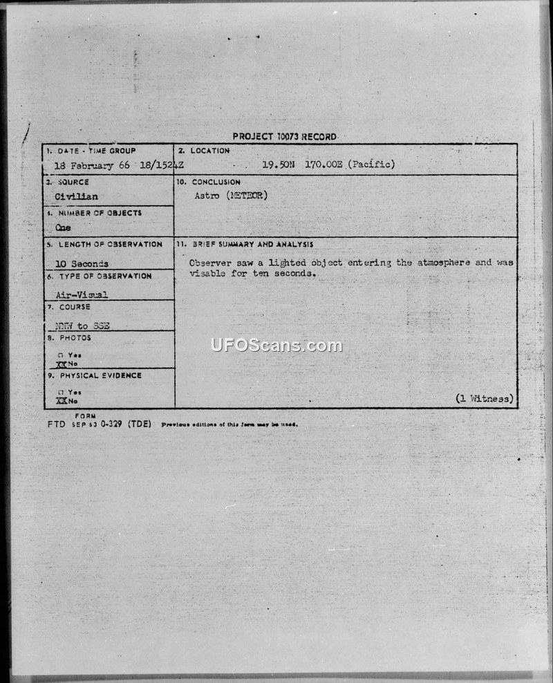 A civilian witness reported a lighted object entering the atmosphere over the Pacific on February 18, 1966. The event was officially classified as a meteor.