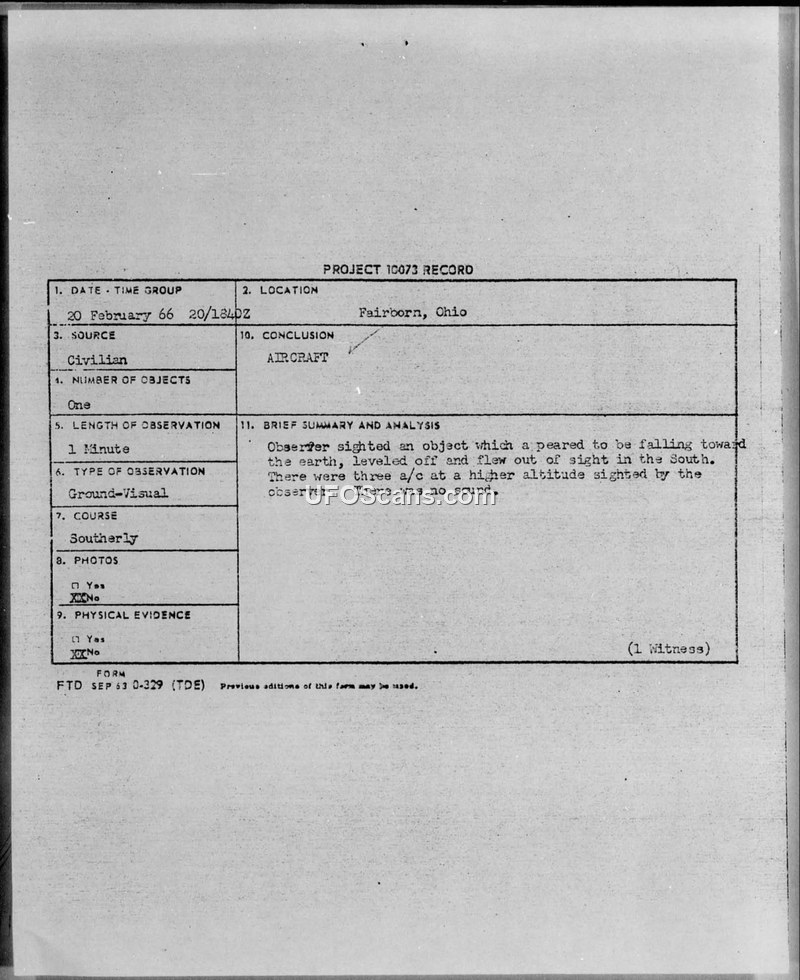 Project 10073 Record — Fairborn, Ohio, 20 February 1966