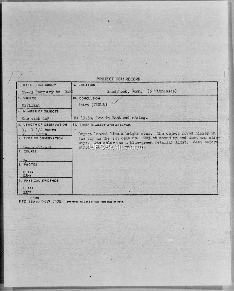 A civilian report of an unidentified object in Sandyhook, Connecticut, in February 1966, which was officially identified by the Air Force as the planet Venus.