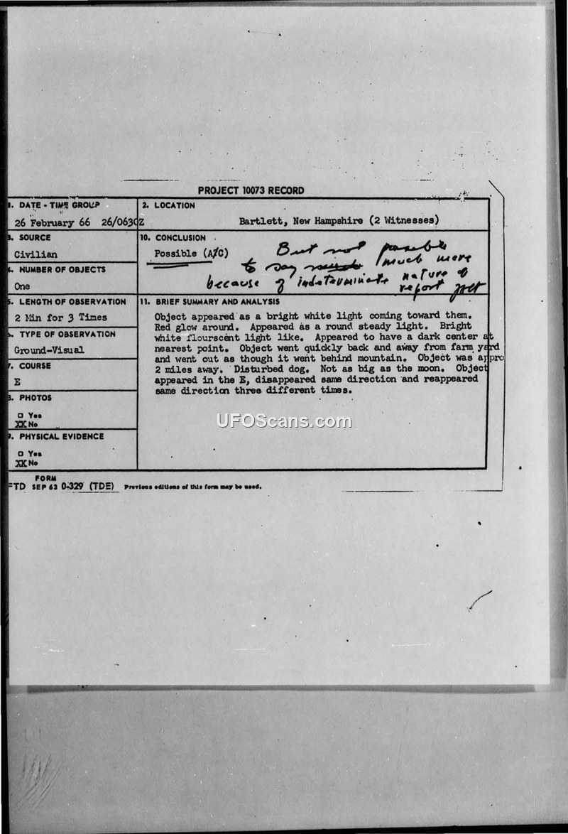Project 10073 Record: Sighting in Bartlett, New Hampshire, 26 February 1966