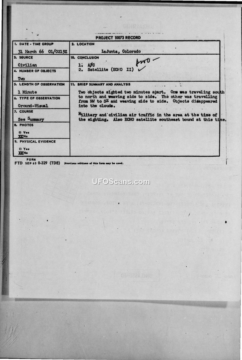 A civilian sighting of two objects in LaJunta, Colorado, on March 31, 1966, was investigated by the Air Force. The objects were officially identified as an aircraft and the ECHO II satellite.