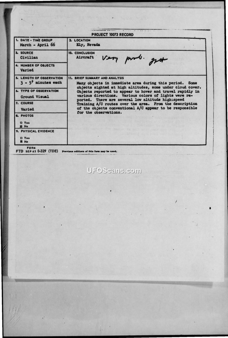 A series of UFO sightings in Ely, Nevada, in 1966 were investigated by the U.S. Air Force. The official conclusion attributed the observations to conventional aircraft on military training routes.