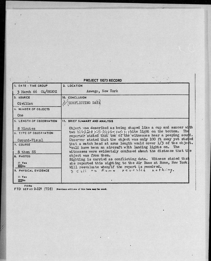 Project 10073 Record — Aswego, New York, 3 March 1966