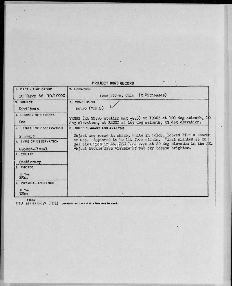 Project 10073 Record — Youngstown, Ohio, 10 March 1966