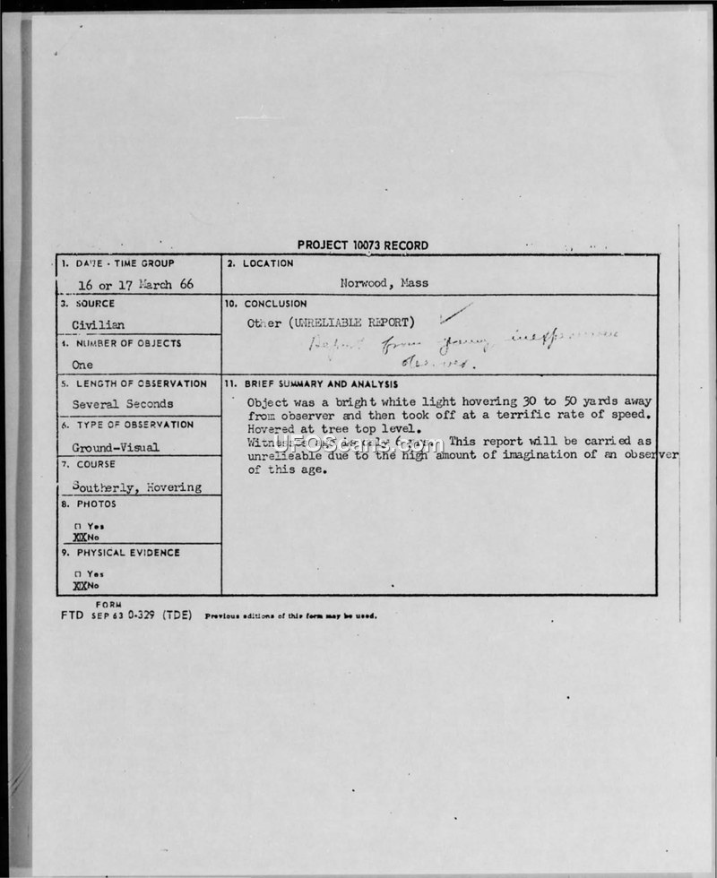 A 6-year-old child reported a hovering white light in Norwood, Massachusetts, in March 1966. The Air Force officially classified the report as unreliable due to the witness's age.