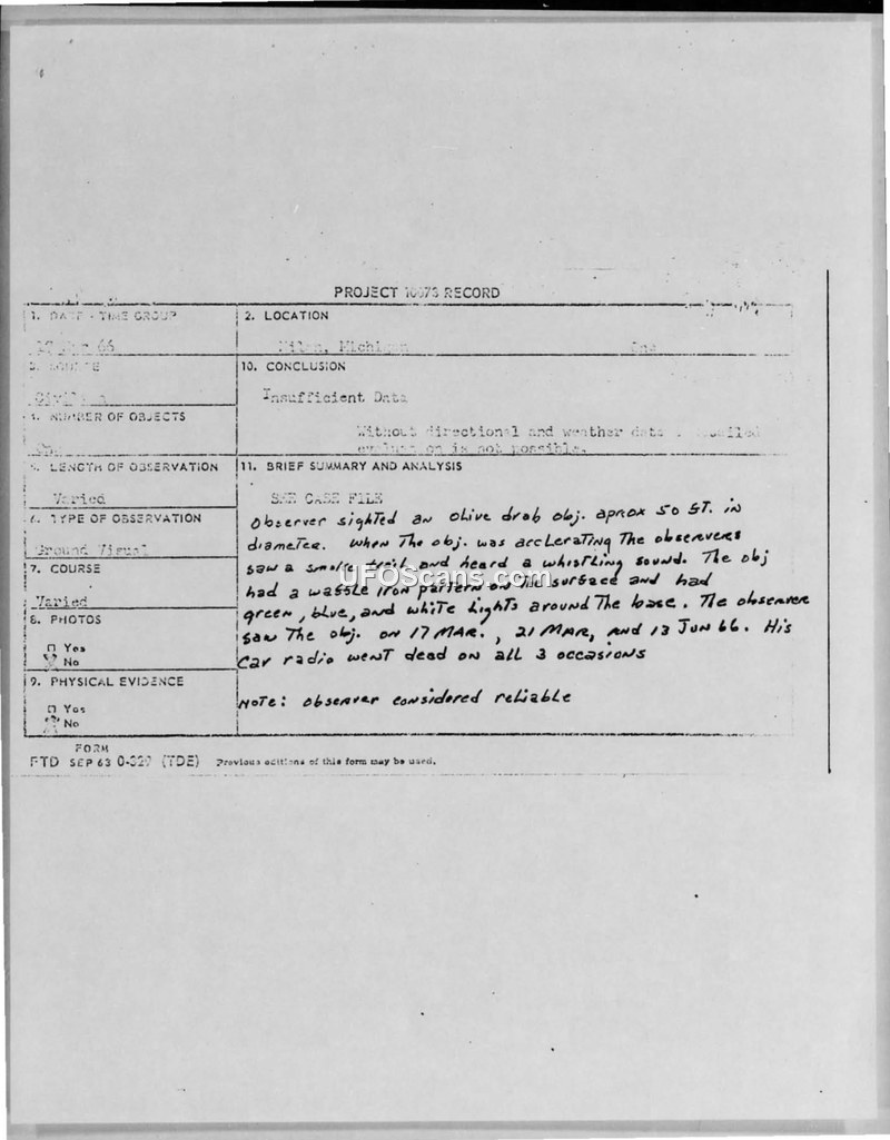 This document is a Project 10073 record detailing three separate sightings of an unidentified flying object by a single observer in Milan, Michigan, in 1966. The observer, identified as a police officer, reported seeing a round, flat object with a bulge on top and a 'waffle iron' surface pattern on March 17, March 21, and June 13. The object was described as olive drab or brown in color, approximately 50 feet in diameter, and featured blue, green, and white lights around its base. During each encounter, the observer reported that their car radio went dead. The object exhibited various maneuvers, including hovering, swinging side to side, and landing at an intersection before taking off in a climbing flight path. The Air Force report, prepared by Major F. L. Brokaw, concludes that the object is of unknown origin and that there is insufficient data to provide a definitive identification, noting that the sighting characteristics align with other reports found in media.