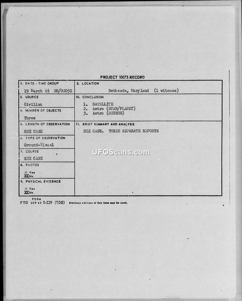 Project 10073 Record: Sighting Reports — Bethesda, Maryland, 19 March 1966