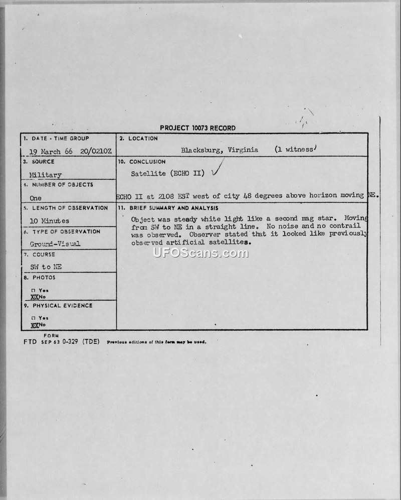 On 19 March 1966, at 2110 EST, Lt Col Theodore M. Fite of AFROTC Detachment 875 at Virginia Polytechnic Institute observed an unidentified object in the sky over Blacksburg, Virginia. The sighting, which lasted approximately 10 minutes, involved a single, steady white light comparable in brightness to a second-magnitude star. The object moved in a straight line from the southwest to the northeast, passing north of Polaris. Lt Col Fite, a rated Command Pilot, noted that the object exhibited no engine noise, no visible contrail, and no blinking or flickering. He observed the object through 7X glasses and confirmed the sighting with two other witnesses. The report was forwarded to the Foreign Technical Division at Wright-Patterson Air Force Base. The official conclusion reached by the project was that the object was the ECHO II satellite.