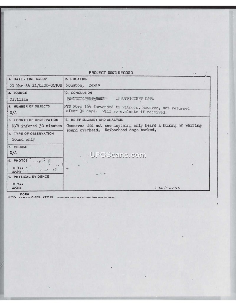 This document contains a collection of Project 10073 records and correspondence regarding Unidentified Aerial Phenomena (UAP) sightings, primarily centered in Houston, Texas, during March 1966. The records include standardized sighting reports, correspondence from the Foreign Technology Division (FTD) of the Air Force Systems Command, and letters from civilians reporting their observations. The reports describe various phenomena, ranging from unidentified lights and sounds to objects described as having specific shapes and behaviors. Many of the reports were evaluated by Major Hector Quintanilla, Jr., Chief of Project Blue Book. Several sightings were concluded to be astronomical phenomena, such as the planet Venus or meteors, while others were identified as aircraft. Some reports were classified as 'insufficient data' because witnesses failed to return the requested FTD Form 164 for further evaluation. The document also includes internal correspondence regarding the analysis of photographs, including a case involving Australian UFO photographs, and administrative records related to the management of these files. The overall tone of the correspondence is administrative and investigative, reflecting the Air Force's systematic approach to documenting and evaluating UAP reports during this period.