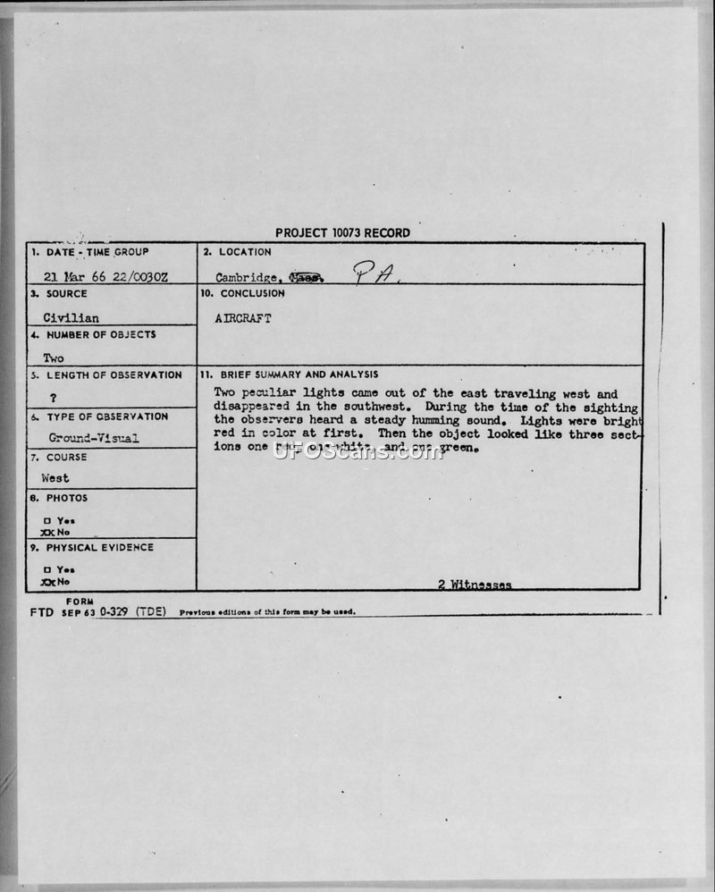A civilian report of two unidentified lights in Cambridge, Pennsylvania, on March 21, 1966, which was officially classified by the Air Force as an aircraft.