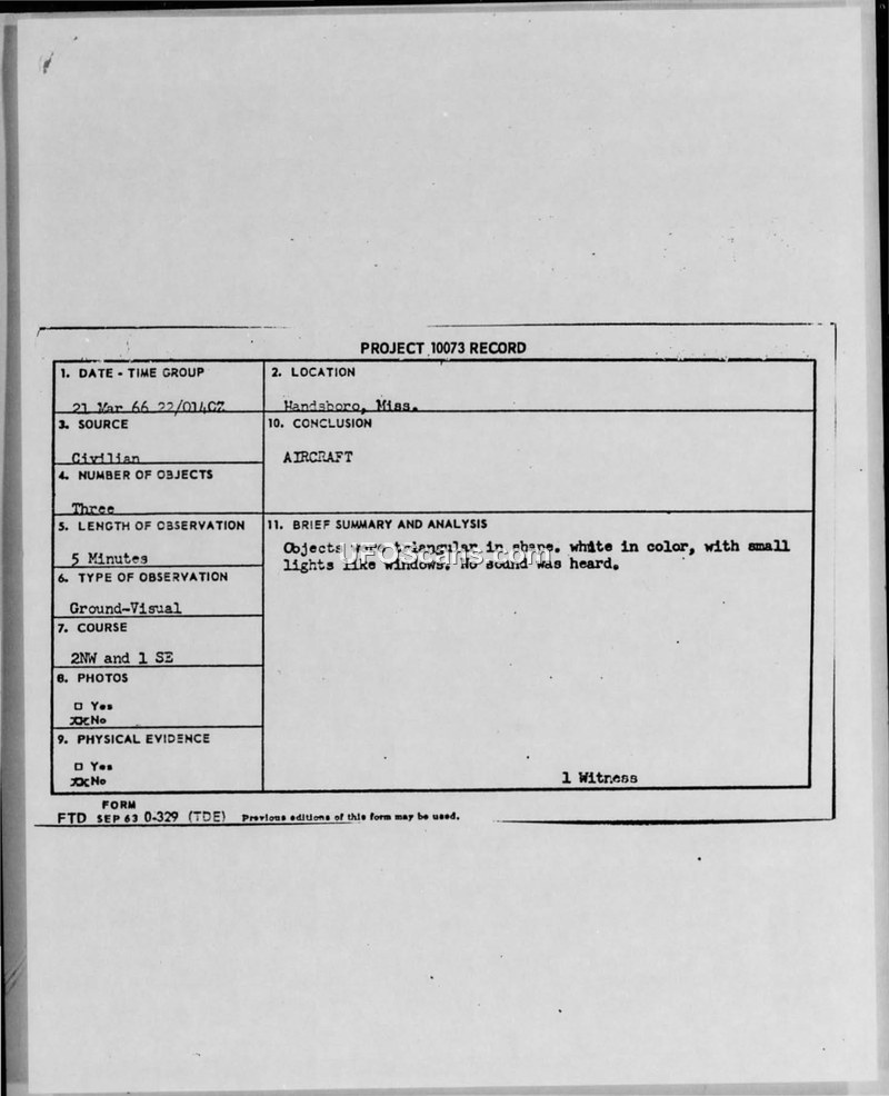 Project 10073 Record — Handsboro, Mississippi, 21 March 1966