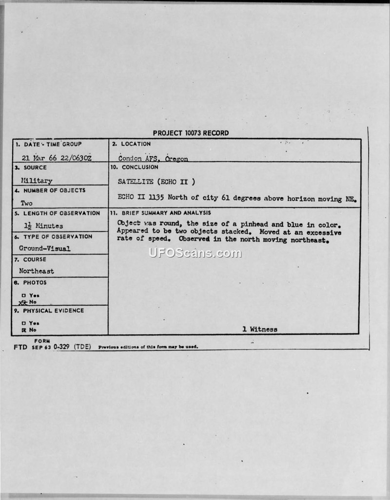 A sighting of a round, blue, stacked object at Condon AFS, Oregon, on March 22, 1966, was officially identified by the Air Force as the ECHO II satellite.