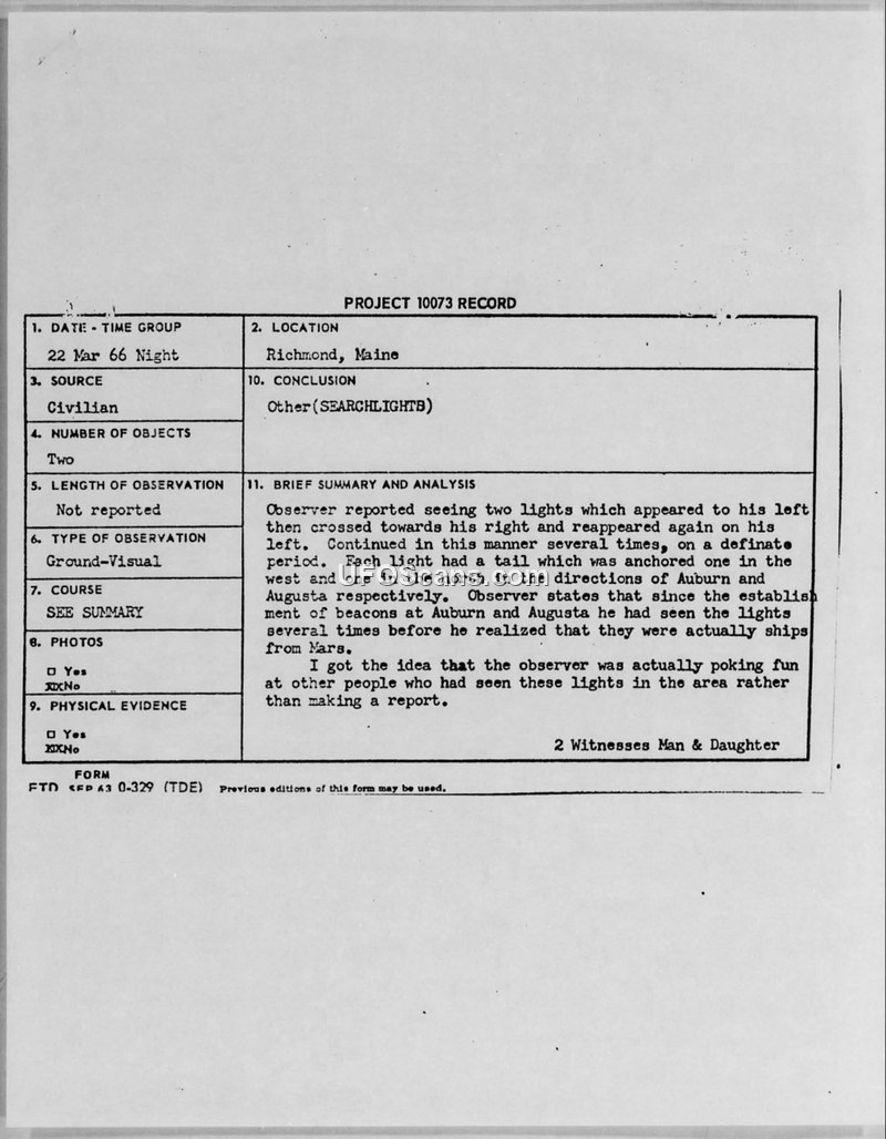 PROJECT 10073 RECORD — Richmond, Maine, 22 March 1966