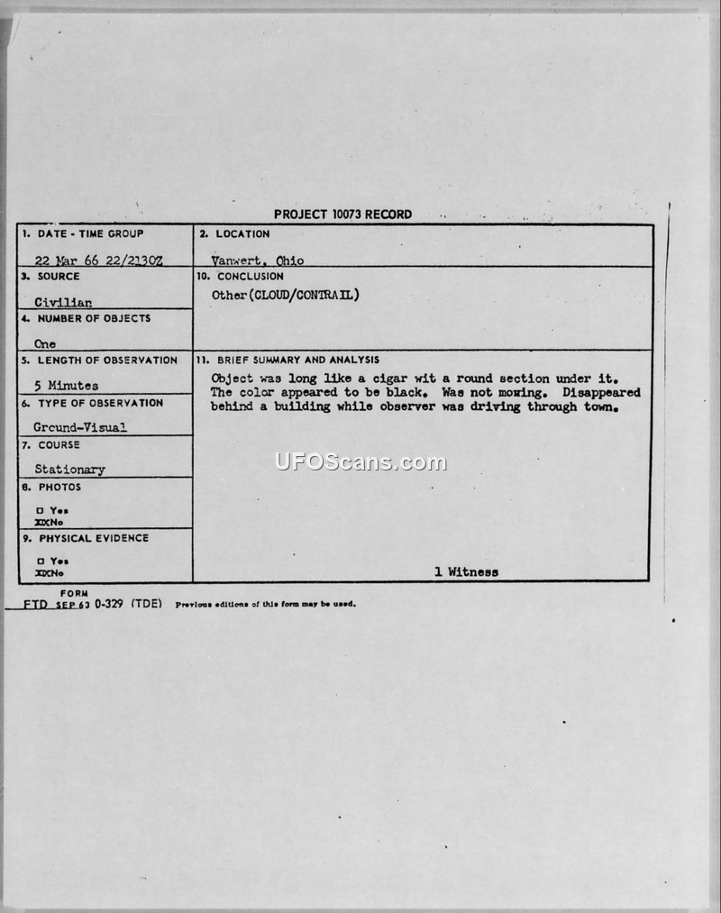 A civilian reported a stationary, black, cigar-shaped object in Vanwert, Ohio, on March 22, 1966. The U.S. Air Force officially categorized the sighting as a cloud or contrail.