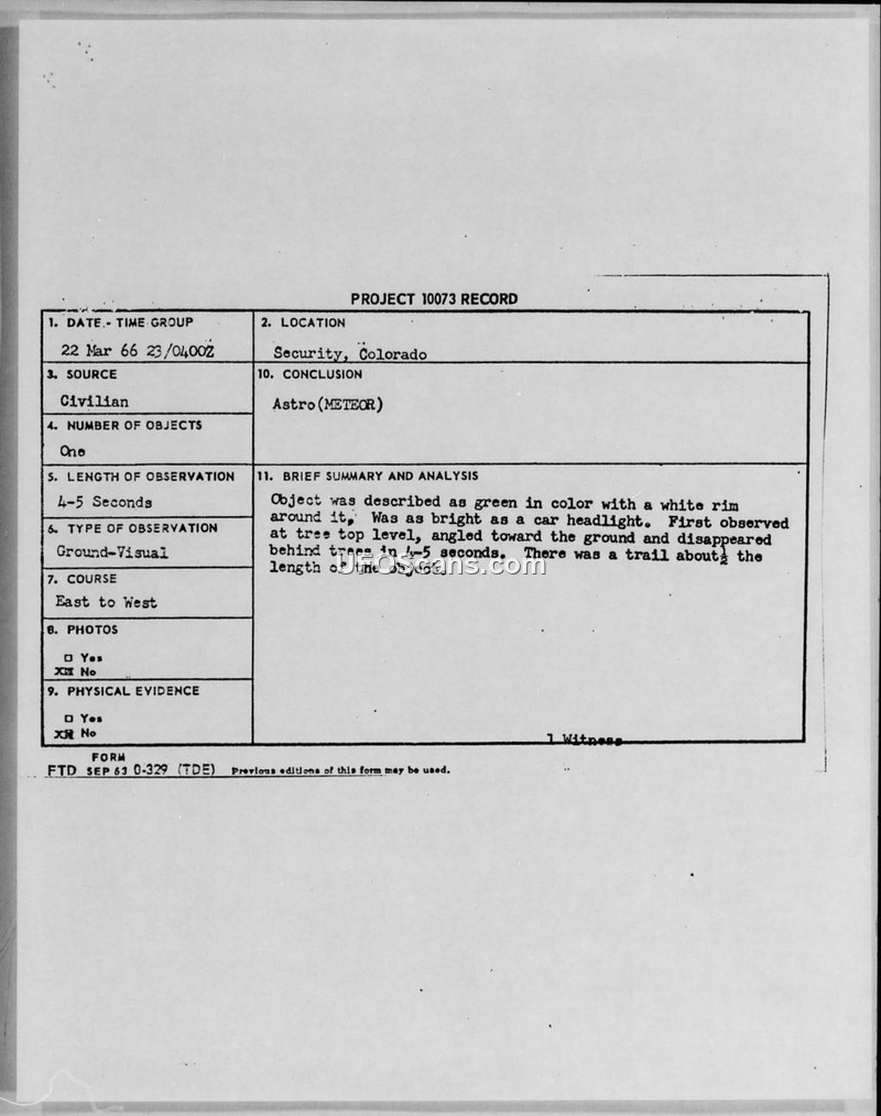 Project 10073 Record: Sighting in Security, Colorado, 22 March 1966