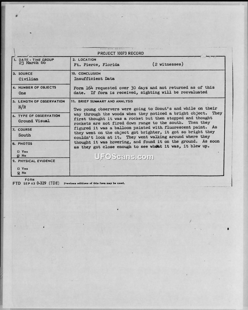 A 1966 UFO sighting report from Ft. Pierce, Florida, involving two witnesses who observed an object that allegedly exploded on the ground. The Air Force closed the case as 'Insufficient Data' after the witnesses failed to return a formal report.
