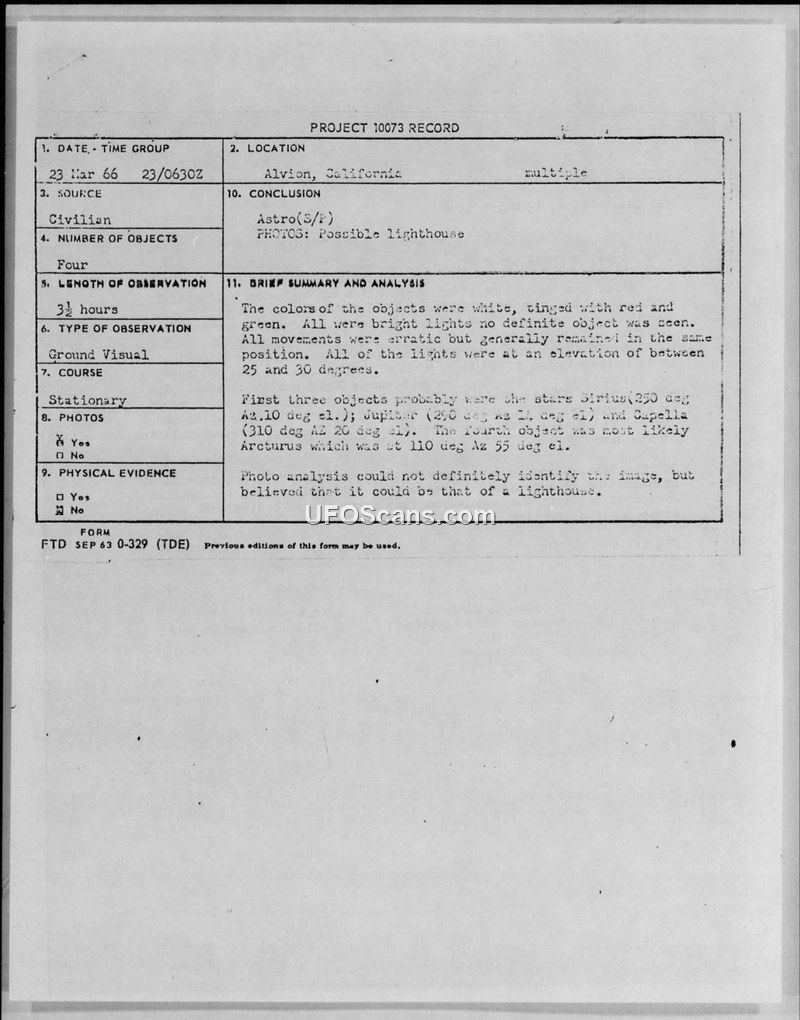 This document collection details the investigation of a UFO sighting reported on 23 March 1966, near the Point Cabrillo Coast Guard Light Station in California. The initial report, filed by personnel at the station including Engineman 2nd Carl Fullenwider, described four bright, erratic lights observed over a period of three and a half hours. The witnesses reported the lights were white, tinged with red and green, and remained generally stationary at an elevation of 25 to 30 degrees. An RC-121 aircraft was diverted to the area to investigate, but no sighting was made by the flight crew. The Foreign Technology Division (FTD) of the Air Force Systems Command requested and received photographic evidence, consisting of two color slides and two prints taken by the witnesses using an Olympus 35mm camera. The subsequent photo analysis, conducted by Intelligence Research Specialist Thomas E. Davis and approved by Major William L. Turner and Wilber Price, Jr., concluded that the imagery was inconclusive but likely depicted the Point Cabrillo lighthouse and its associated structures. Furthermore, the FTD concluded that the visual descriptions provided by the witnesses were consistent with astronomical observations, specifically identifying the objects as the stars Sirius, Capella, Arcturus, and the planet Jupiter. The case was closed with the determination that astronomical bodies were responsible for the sighting.
