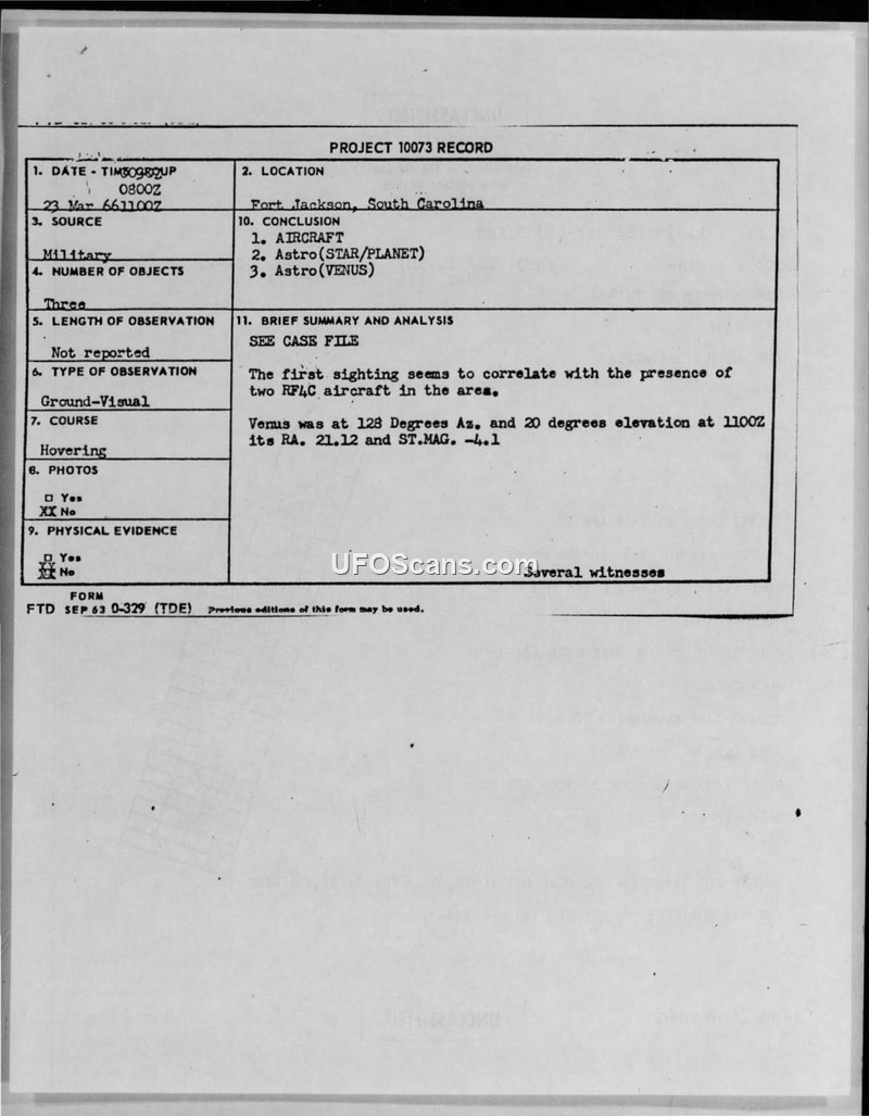 A series of UFO sightings at Fort Jackson, SC, in March 1966 were reported by military personnel. The Air Force attributed the first sighting to military aircraft activity, while the subsequent sightings remained unexplained.
