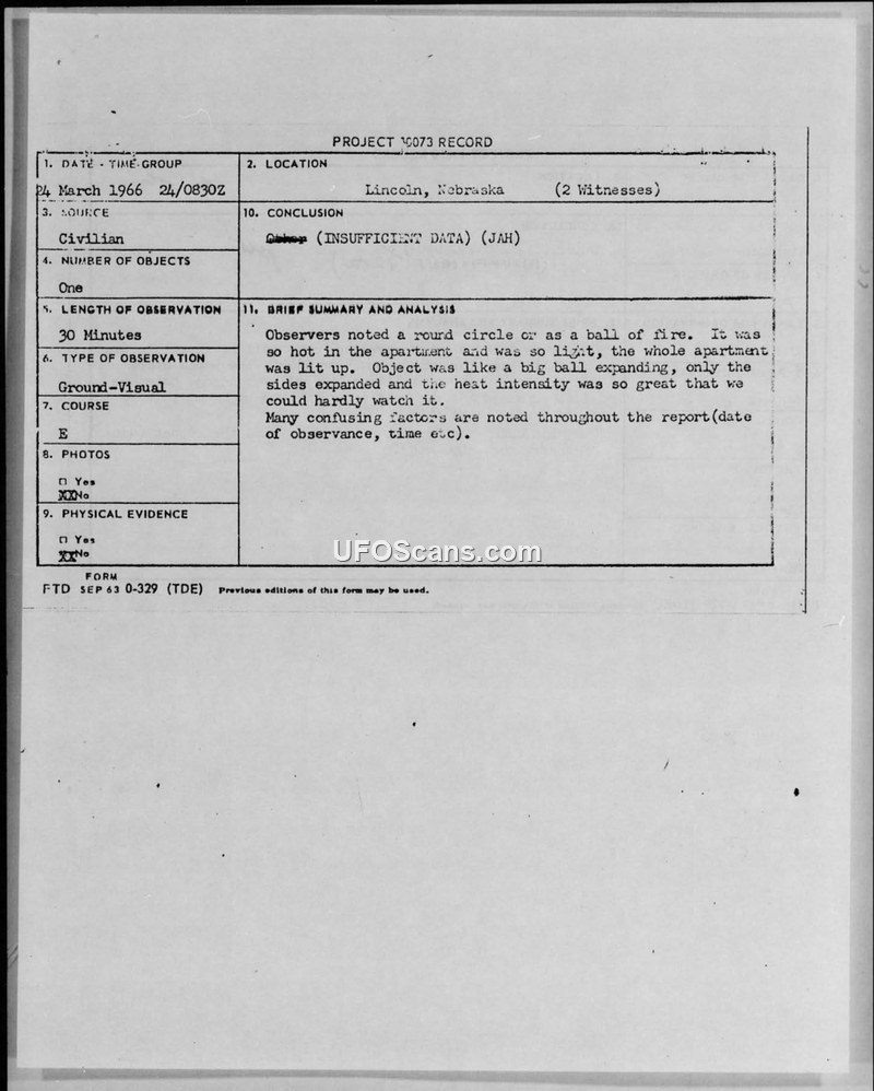 A civilian couple in Lincoln, Nebraska, reported a 30-minute sighting of a bright, heat-emitting, ball-like object in March 1966. The Air Force classified the case as 'insufficient data' due to inconsistencies in the report.