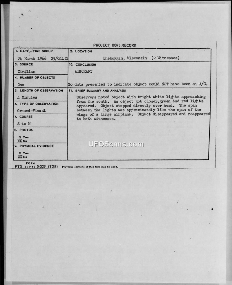 Project 10073 Record — Sheboygan, Wisconsin, 24 March 1966