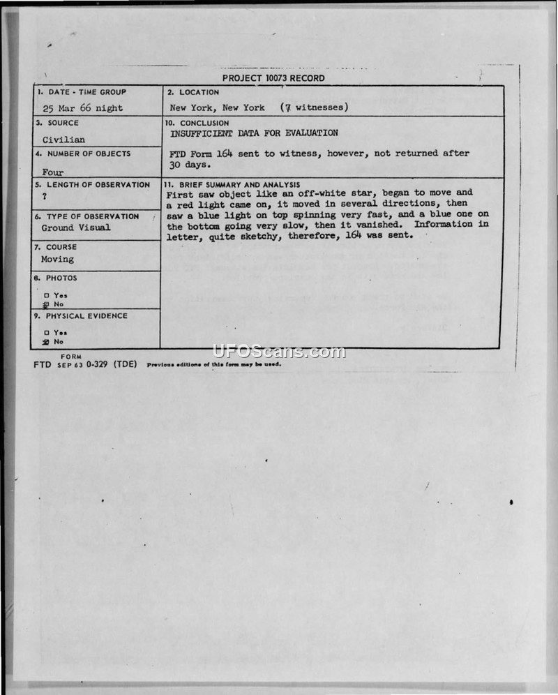This document details a Project Blue Book investigation into an unidentified aerial observation reported by a civilian witness in New York, New York, on the night of March 25, 1966. The witness, who was at Orchard Beach with six other individuals, reported seeing an object that initially resembled an off-white star. According to the witness's letter, the object began to move, displayed a red light, and traveled in several directions. The witness further described a blue light on the top of the object that spun very fast, and a blue light on the bottom that moved very slowly, before the object eventually vanished. The witness expressed a sense of duty in reporting the incident despite potential embarrassment. Following the receipt of this letter, Major Hector Quintanilla, Jr., Chief of Project Blue Book, sent a formal response on June 24, 1966, requesting that the witness complete an FTD Form 164 to provide more detailed information. The project record indicates that the form was never returned by the witness within the 30-day window, resulting in a final conclusion of 'insufficient data for evaluation.'