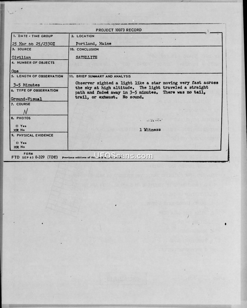 A 13-year-old witness in Portland, Maine, reported a star-like object moving across the sky on 25 March 1966. The Air Force investigated the incident and concluded the object was an orbiting earth satellite.