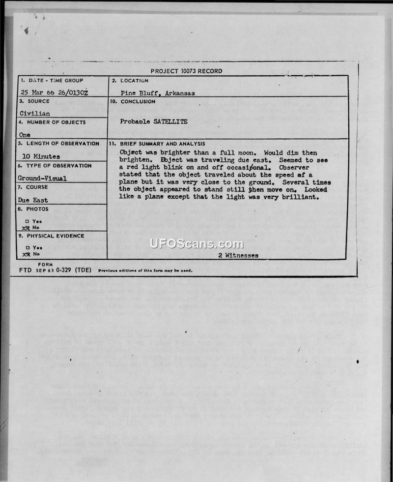 A federal employee reported a silent, brilliant, low-flying object in Pine Bluff, Arkansas, on March 25, 1966. The official military conclusion identified the object as a probable satellite.