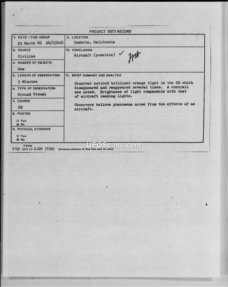 Project 10073 Record — Sighting Report, Cambria, California, 25 March 1966