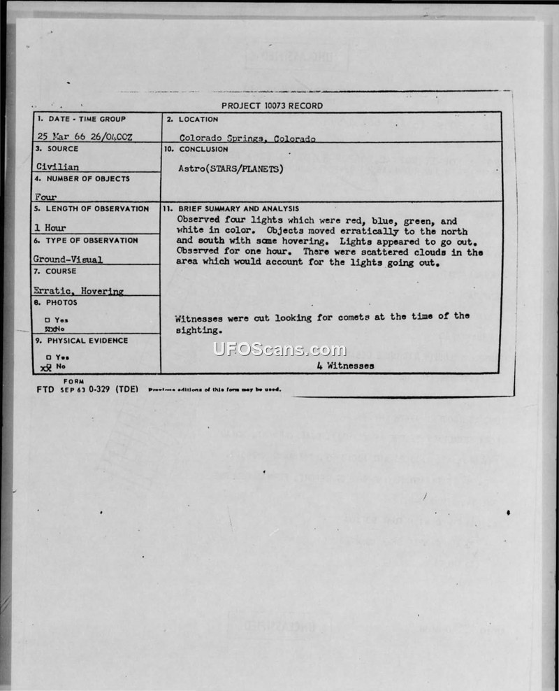 This document collection contains a series of Project 10073 records and associated military correspondence regarding UFO sightings in the vicinity of Colorado Springs, Colorado, during March 1966. The reports detail three distinct incidents involving civilian witnesses. The first incident, on March 25, involved four witnesses observing four lights (red, blue, green, and white) that moved erratically and hovered for one hour. The conclusion for this event was that the lights were astronomical in nature, potentially obscured by scattered clouds. The second incident, on March 28, involved a single object described as egg-shaped, blue-white, and resembling a 'pineapple with legs,' which was visible for 1.5 hours before fading at dawn; this was identified as the planet Venus. The third incident, on March 31, involved a single object described as the size of a grapefruit, white, red, and green, which hovered and bounced before disappearing behind a hill. This was identified as the planet Jupiter. The documentation includes technical details regarding the photography of these events, noting that the sightings were captured using a Yashica Lynx 35mm camera with Kodak Ektachrome High Speed film. Military officials, including Lt Col M.J. Loftus and Maj Quintanilla, processed these reports. A significant portion of the correspondence addresses administrative errors, specifically the misrouting of UFO-related photographic packages to Andrews AFB instead of the Foreign Technology Division (FTD) at Wright-Patterson AFB. The reports emphasize that the sighting locations were in areas frequently used by military and commercial aviation, and that some sightings were likely caused by vehicle or spotlight reflections.