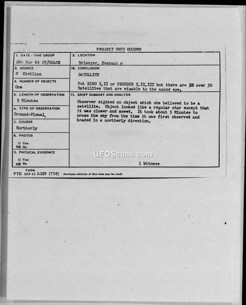On March 26, 1966, a civilian observer in Erlanger, Kentucky, reported sighting an unidentified object in the sky. The observer first noticed the object at approximately 8:40 p.m. while it was positioned in the center of the sky, slightly to the northwest. Using binoculars, the observer described the object as appearing like a regular star, only closer, and noted that it was bright white in color. The object moved in a northerly direction and took approximately five minutes to cross the sky before leaving the observer's view. The observer subsequently wrote to Wright-Patterson Air Force Base to inquire whether the object was a satellite or a star. The official Project 10073 record concluded that the object was a satellite, noting that while it was not one of the specific satellites mentioned by the observer (Echo I, II or Pegasus I, II, III), there were over 30 satellites visible to the naked eye at that time.