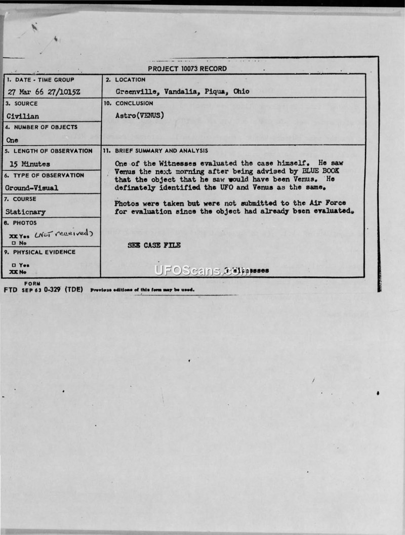 This document is a collection of records, including an incident report and witness questionnaires, regarding a series of sightings of an unidentified aerial phenomenon on March 27, 1966, in the vicinity of Greenville, Vandalia, and Piqua, Ohio. Multiple State Highway Patrol officers, including Patrolmen Welz, Wilhoit, and Landversicht, as well as Cadet Jordan, reported observing a bright light in the sky. The object was described as a bright white or blue-white light, initially spotted near Greenville and later observed near Vandalia and Wright-Patterson Air Force Base (WPAFB). Witnesses estimated the object's altitude at 500-600 feet and its speed at approximately 60 mph, noting that it appeared to hover and move back and forth. Patrolman Landversicht attempted to photograph the object, but the resulting film was blank. The incident was reported to the WPAFB security and law enforcement office, which coordinated with Project Blue Book. Major Hector Quintanilla, head of Project Blue Book, evaluated the reports and concluded that the object was the planet Venus. The official analysis suggested that the perceived movement and swaying of the object were atmospheric illusions experienced by the observers. The document includes internal notes indicating that the Air Force sought to protect the identities of the involved patrolmen and that the dispatcher involved in the report had a chemistry degree and initially suspected the object was the 'morning star.'