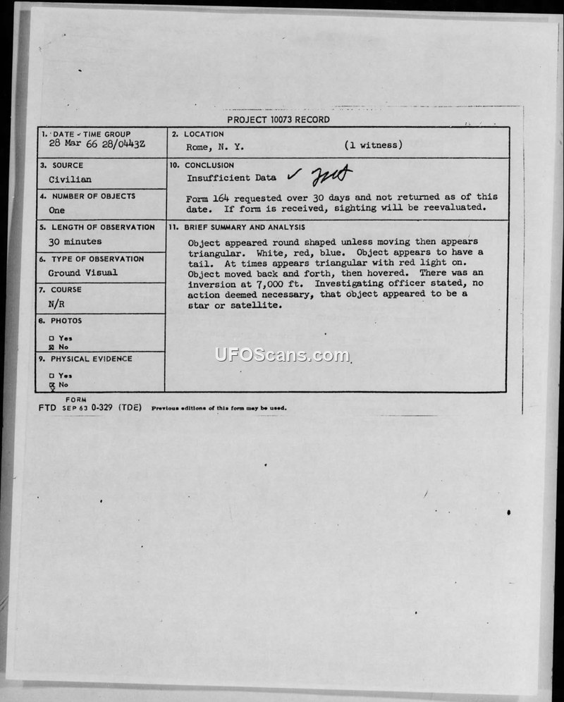 A civilian in Rome, N.Y., reported a 30-minute sighting of a multi-colored, shape-shifting object on March 28, 1966. The Air Force classified the case as 'Insufficient Data' due to the witness's failure to return a follow-up form, noting the object likely appeared to be a star or satellite.