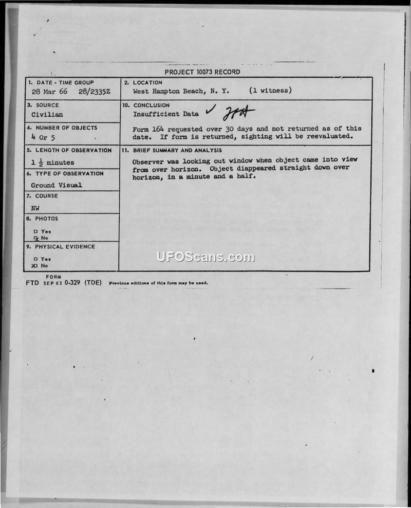 Project 10073 Record — West Hampton Beach, N. Y. — 28 March 1966