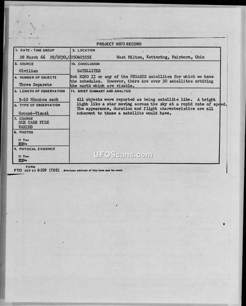 Project 10073 Record — 28 March 1966 Sighting, West Milton, Ohio