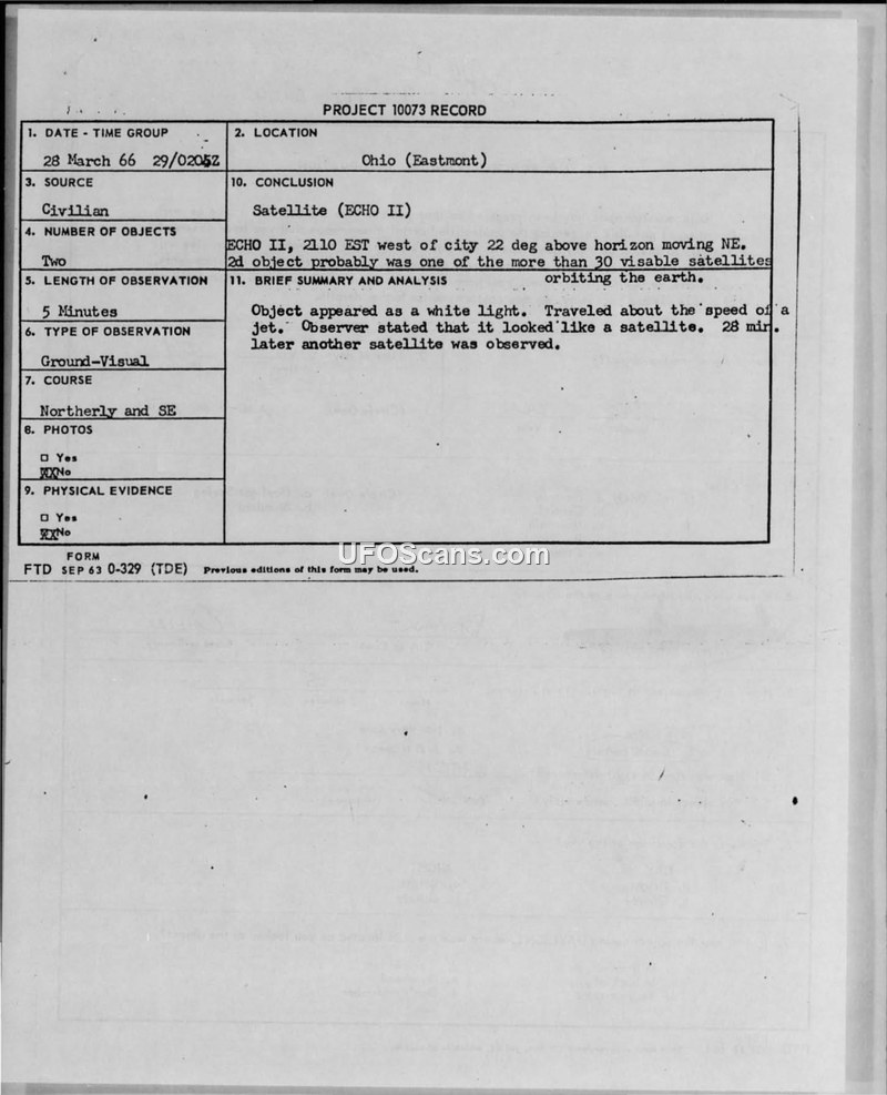 A civilian report of two objects in Eastmont, Ohio, on March 28, 1966, was officially identified by the U.S. Air Force as the ECHO II satellite and another orbiting satellite.