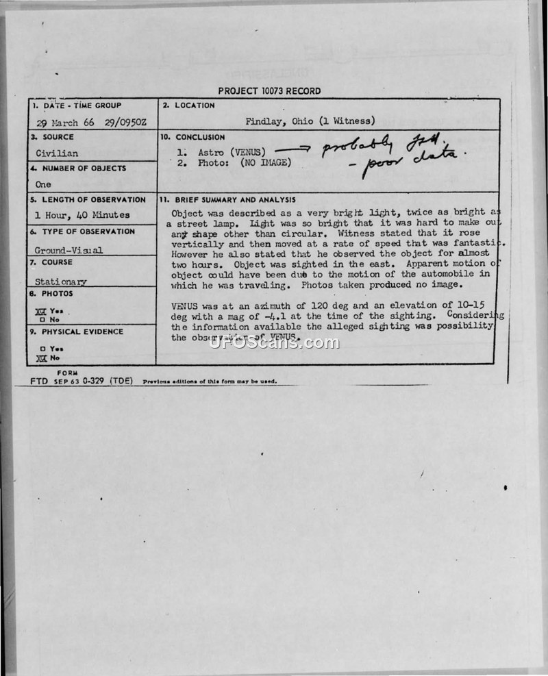 Project 10073 Record: UFO Sighting, 29 March 1966, Findlay, Ohio