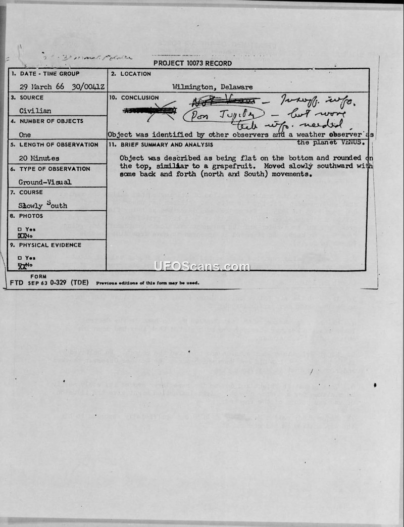 A UFO sighting in Wilmington, Delaware, on 29 March 1966 was investigated by Major Thomas L. Ruddy. The object was officially identified as the planet Venus, with its appearance attributed to atmospheric haze and light refraction.