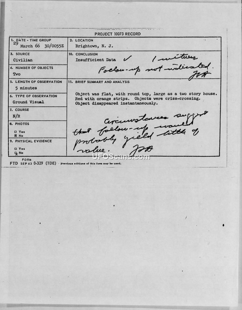 Project 10073 Record — Brightown, N. J. — 29 March 1966