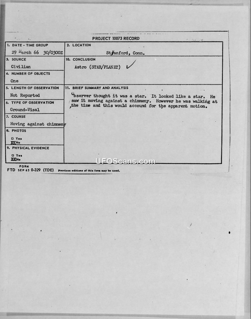 A 1966 UFO sighting in Stamford, Connecticut, by a Naval Reserve Intelligence officer was investigated under Project 10073. The object was officially identified as a star or planet, with the perceived movement attributed to the observer's own motion.