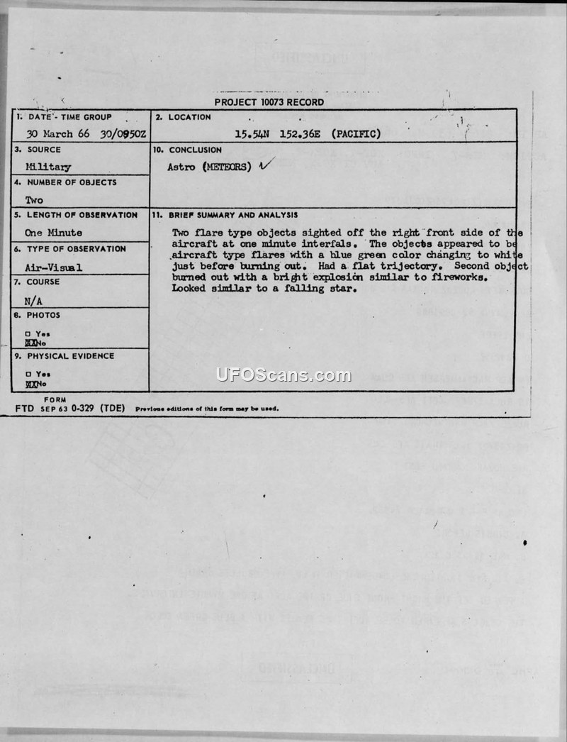 On March 30, 1966, at 0950Z, the crew of a C-124 aircraft (MAC 10153) observed two unidentified flare-type objects while flying over the Pacific at coordinates 15.54N 152.36E. The sighting lasted for approximately one minute. The objects appeared off the right-front side of the aircraft at one-minute intervals, passing within half a mile of the plane. The objects were described as having a blue-green color that changed to white just before burning out. The first object burned out at 9,000 feet, and the second at 6,000 feet. The crew noted that the objects followed a flat trajectory and that the second object ended with a bright explosion similar to fireworks. The pilot, Major C. C. Clayton of the 8th MAS, McCord Air Force Base, reported that if the objects were fired, they were fired in the air and not from the surface. The official conclusion recorded in the Project 10073 record is that the objects were meteors. The report was retransmitted to the CIA per Form 1392 #939.