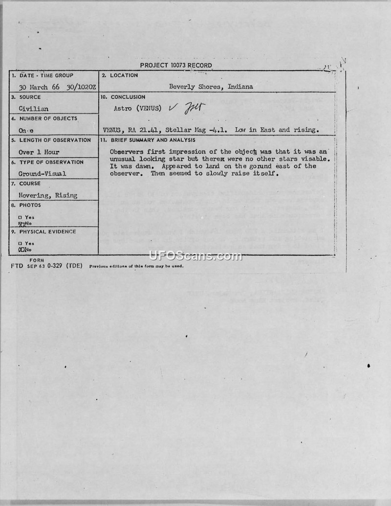 A civilian in Beverly Shores, Indiana, reported a UFO sighting on March 30, 1966, which the Air Force officially identified as the planet Venus. The witness rejected this explanation and expressed concerns about the objects' origins and potential danger.