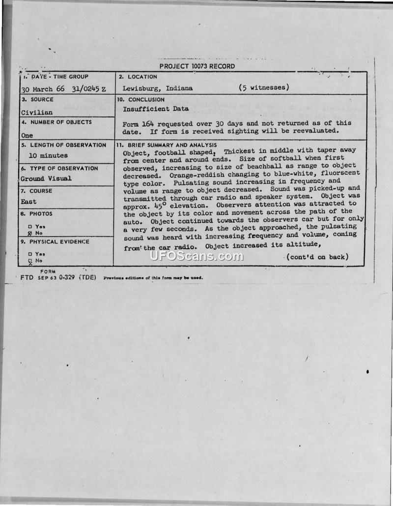 A civilian witness reported a 10-minute sighting of a football-shaped object near Lewisburg, Indiana, on 30 March 1966. The Air Force classified the case as 'Insufficient Data' due to the witness's failure to return a formal report form.